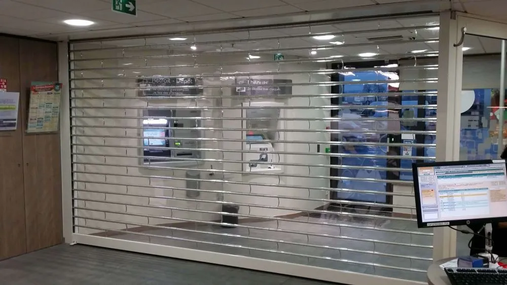 Pour répondre à ces contraintes, l’agence a opté pour un rideau métallique transparent permettant de protéger la zone des automates et de sécuriser l’accès en dehors des horaires d’ouverture.